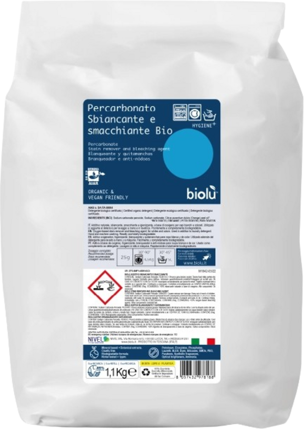 Biolù prah za uklanjanje mrlja prikladan je kao sredstvo za uklanjanje mrlja s bijelog i šarenog tekstila te kao dezinfekcijsko sredstvo za površine.