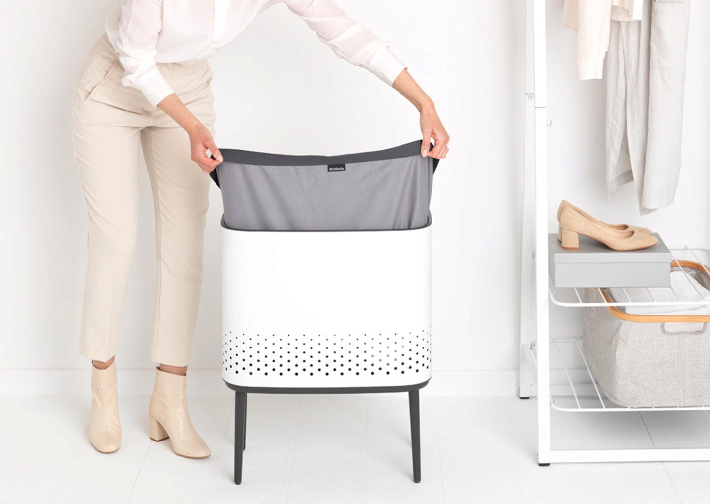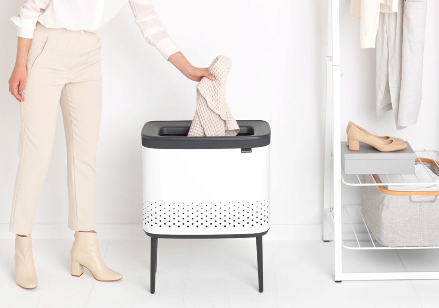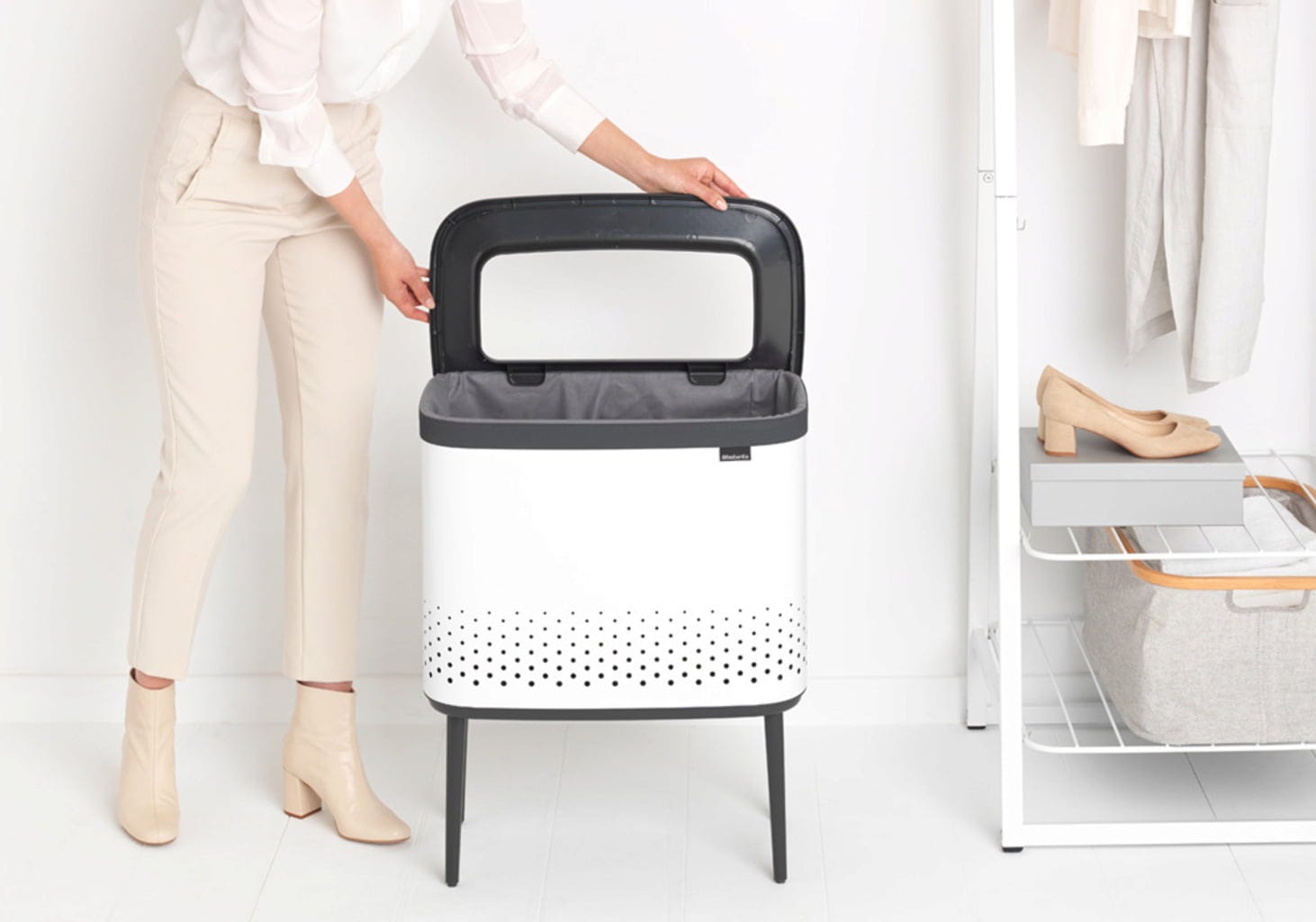 Košara za rublje Bo spaja stil i funkcionalnost na najbolji mogući način. Svojom ravnom stranom pristaje uza zid i štedi prostor, a prilikom odlaganja rublja u košaru više nije potrebno otvarati poklopac jer se zahvaljujući promišljenom Quick-Drop otvoru rublje može ubaciti odjednom, čak i kada su obje ruke pune.