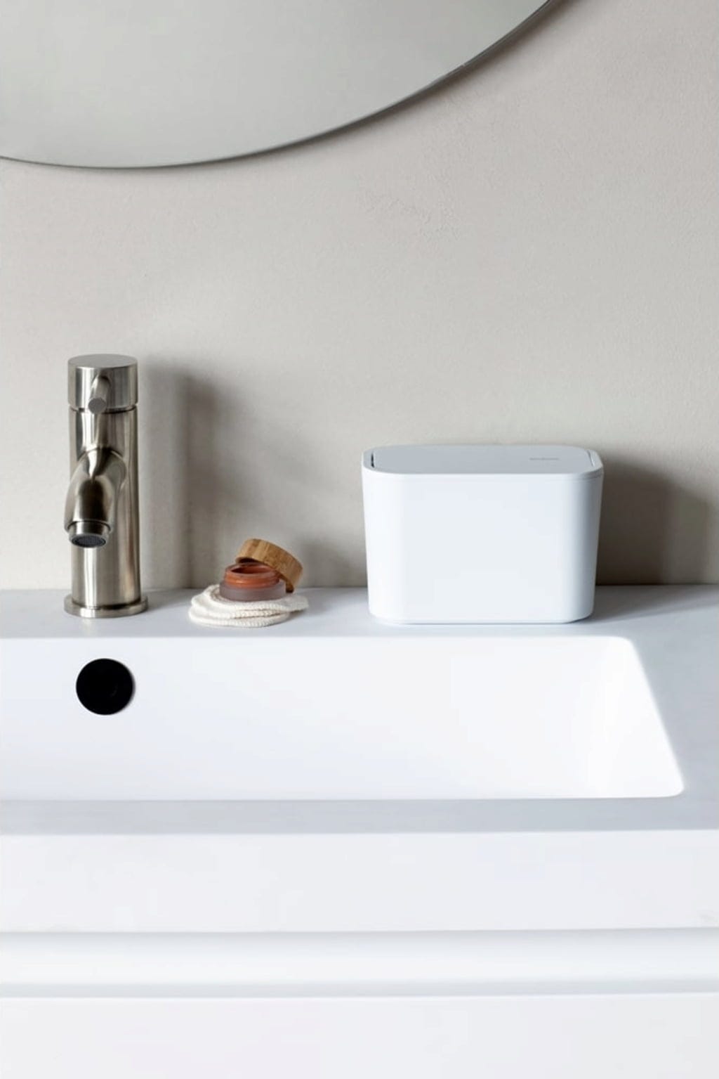 Svakodnevno se u kupaonici nakupljaju otpadni proizvodi poput žileta, blazinica i štapića za uši. Uz ovu funkcionalnu kantu za smeće, odlaganje se sada odvija usput. Zbog svog jednostavnog dizajna i kompaktne veličine ne zauzima puno prostora, dok praktičan poklopac koji se njiše omogućuje jednostavno odlaganje smeća. Zahvaljujući protukliznom dnu, kanta je stabilna i na skliskim površinama, bez izazivanja ogrebotina.