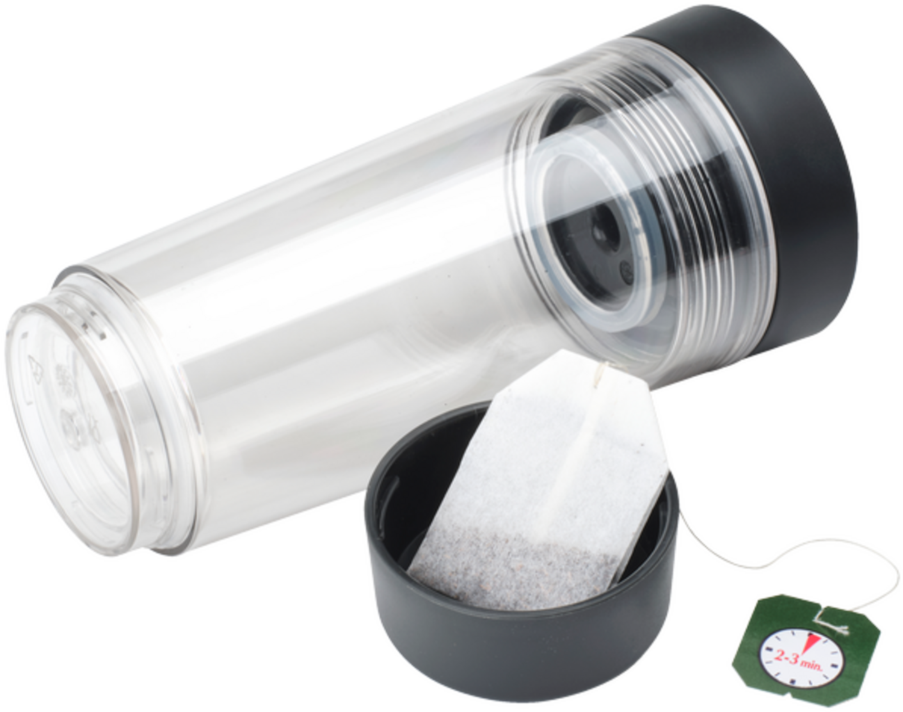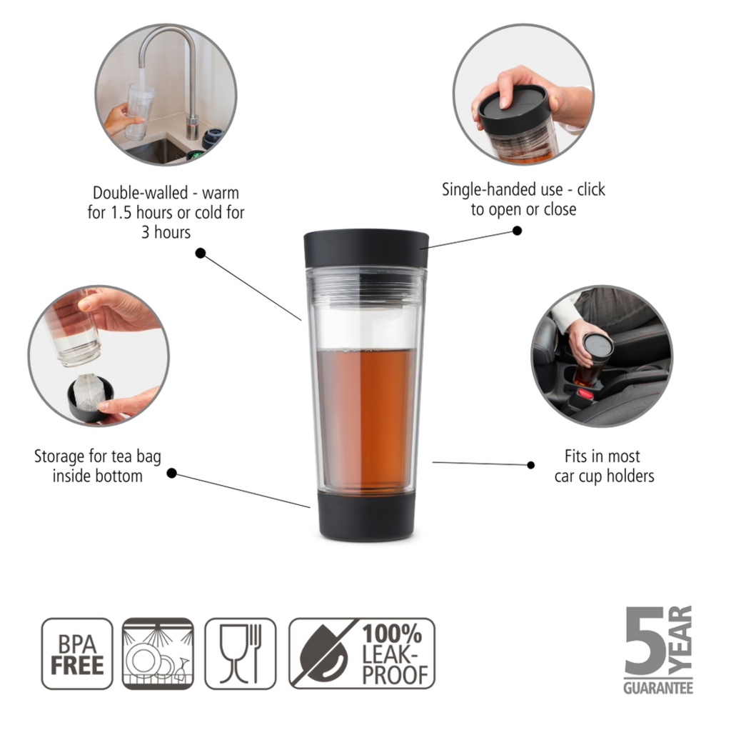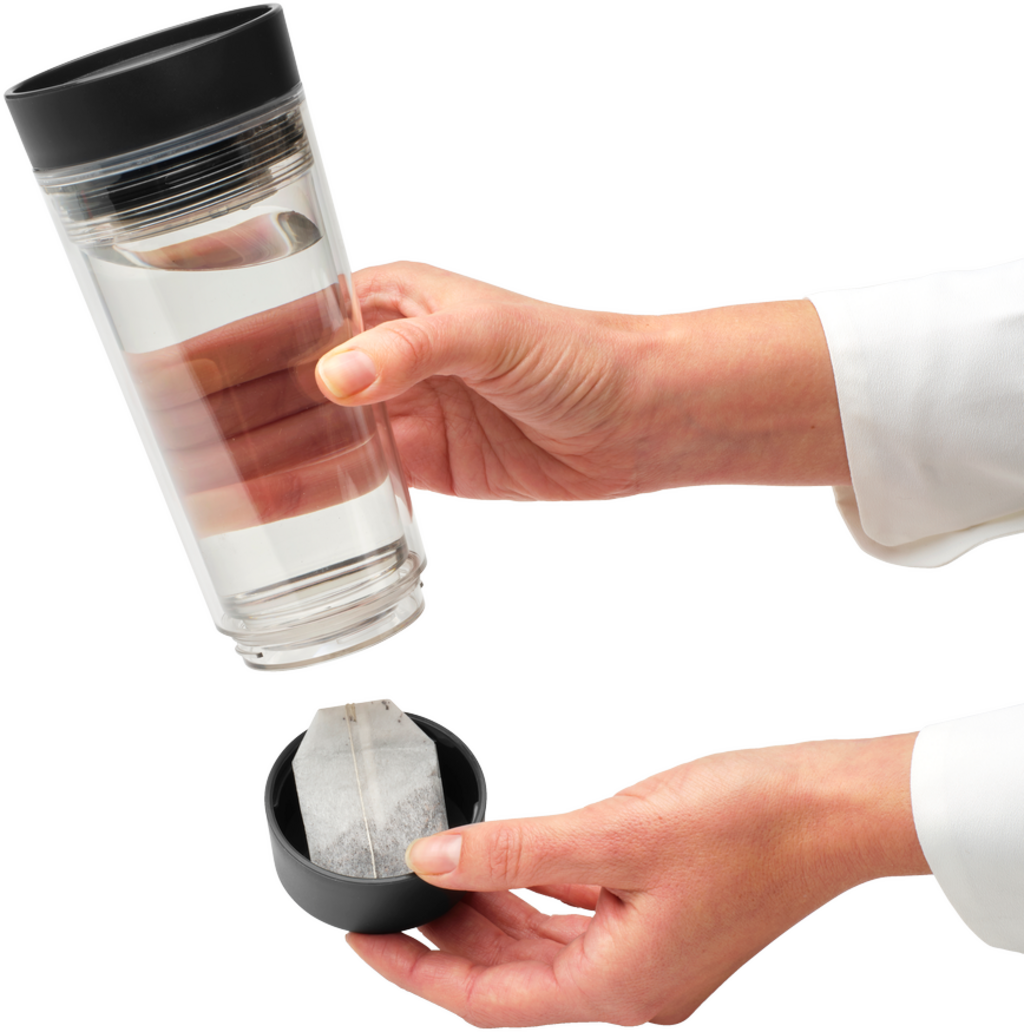Uživajte u svježe kuhanom čaju uvijek i svugdje! Nepropusna šalica za čaj s pametnim pretincem za vrećice čaja na dnu po želji održava omiljeni napitak toplim ili hladnim. Ulijte vruću vodu kod kuće, dodajte vrećicu čaja usput, i gotovo! A najbolje od svega: Zatvarač se može otvoriti i zatvoriti jednom rukom samo jednim klikom bez napora.