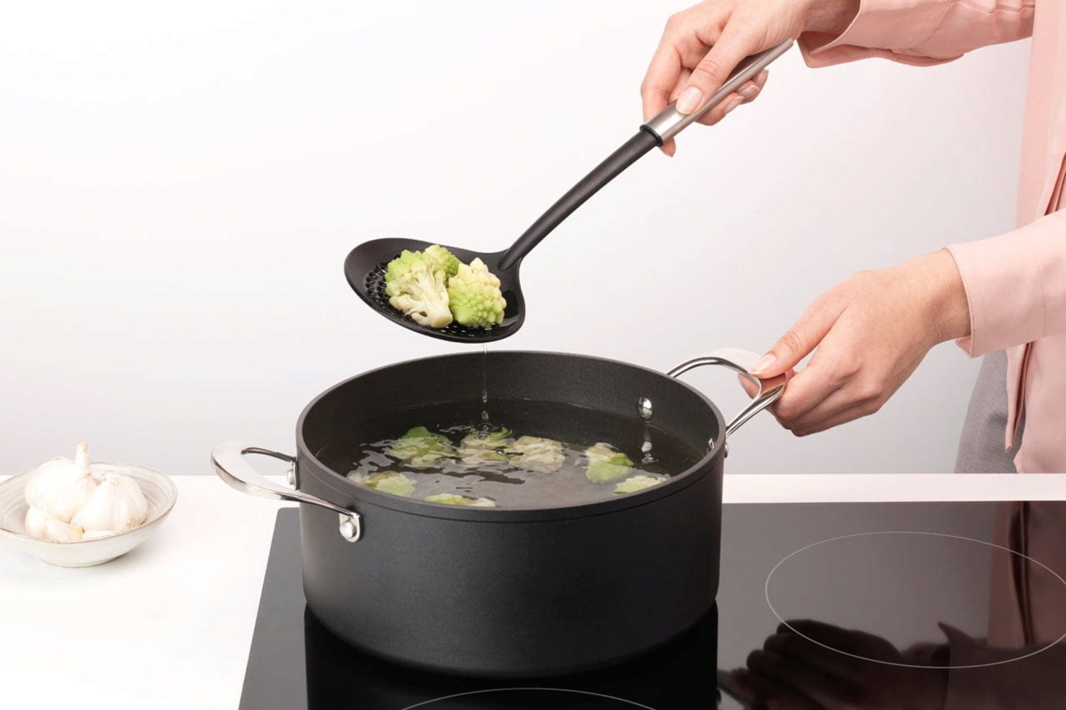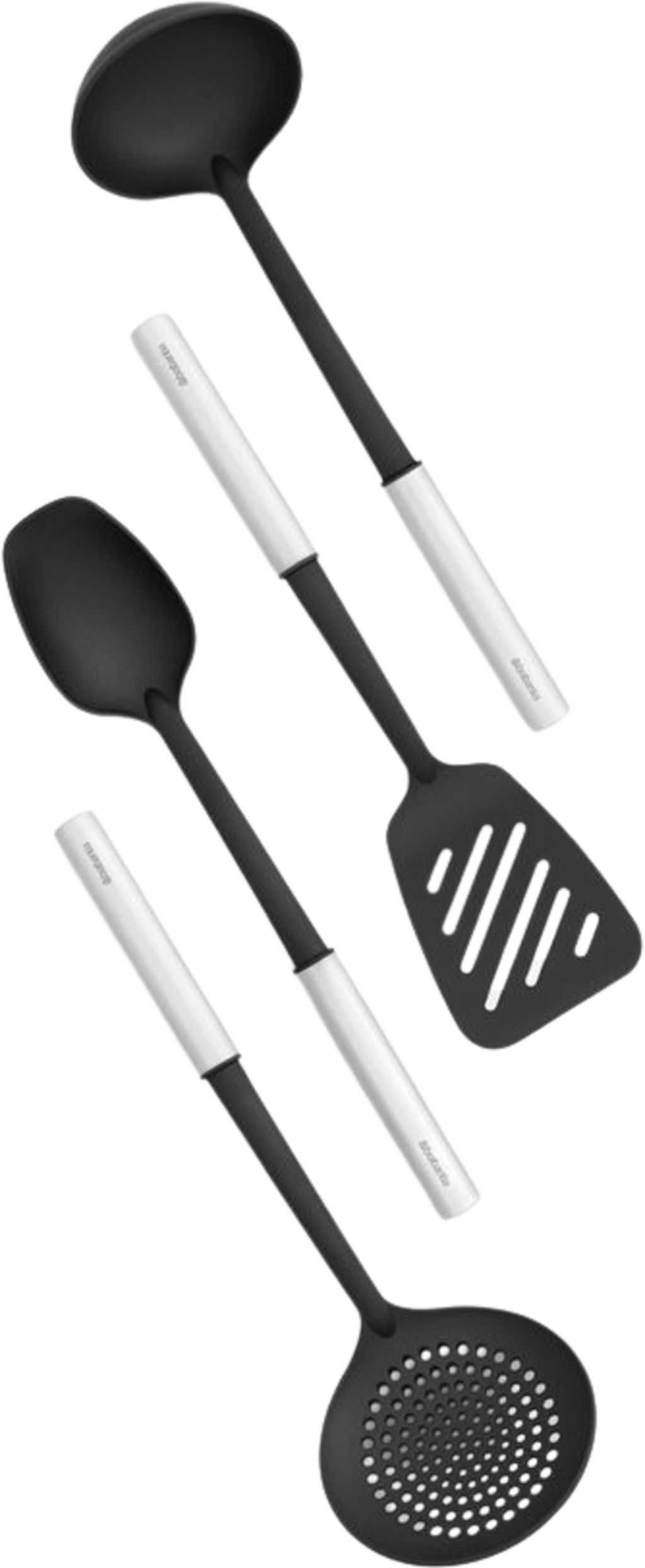 Idealna kuhinjska pomagala u setu: zaimača za juhu, žlica za povrće, lopatica za okretanje i žlica za obiranje – za okretanje, doziranje, grabljenje i posluživanje. Tako je kuhinja odjednom vrhunski opremljena – za pravog kuhara!
