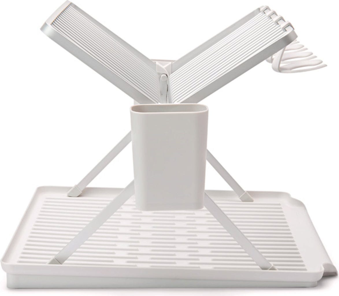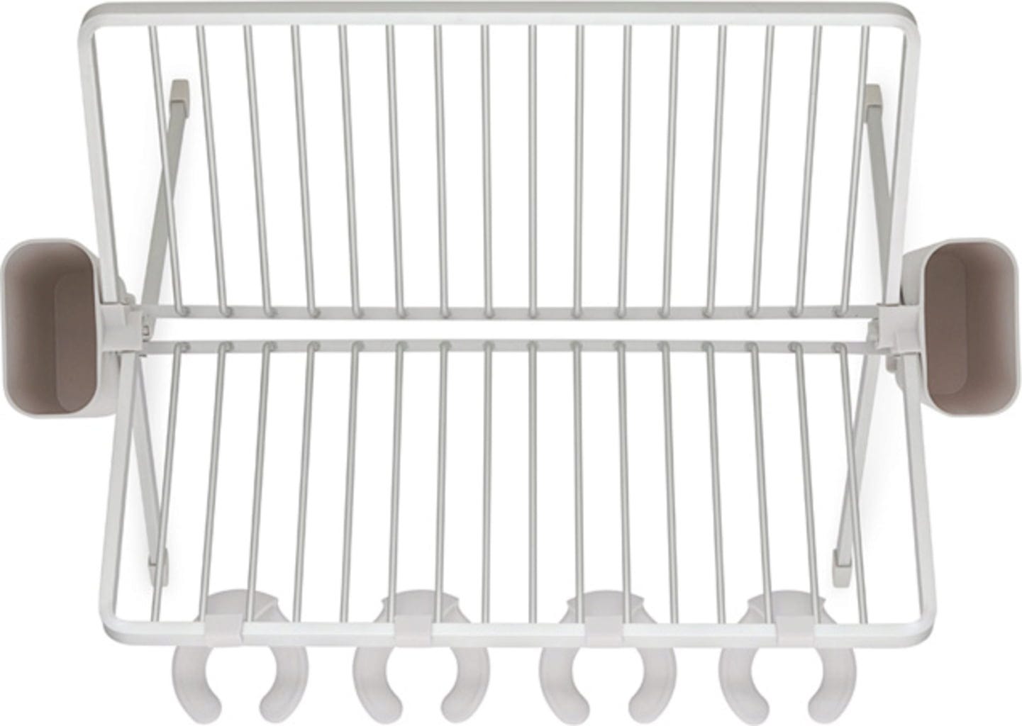 Ovaj stalak za sušenje posuđa od aluminija, jednako praktičan koliko i vizualno privlačan, s rebrastom plastičnom posudom i dvije odvojive košare za pribor za jelo, gotovo je šteta sklopiti. Ipak, može se sklopiti u tren oka i kompaktno pospremiti. Nudi prostor za do 17 tanjura, a i lonci, tave i čaše također će pronaći svoje mjesto. Potonje se mogu sigurno objesiti na četiri praktične kuke.