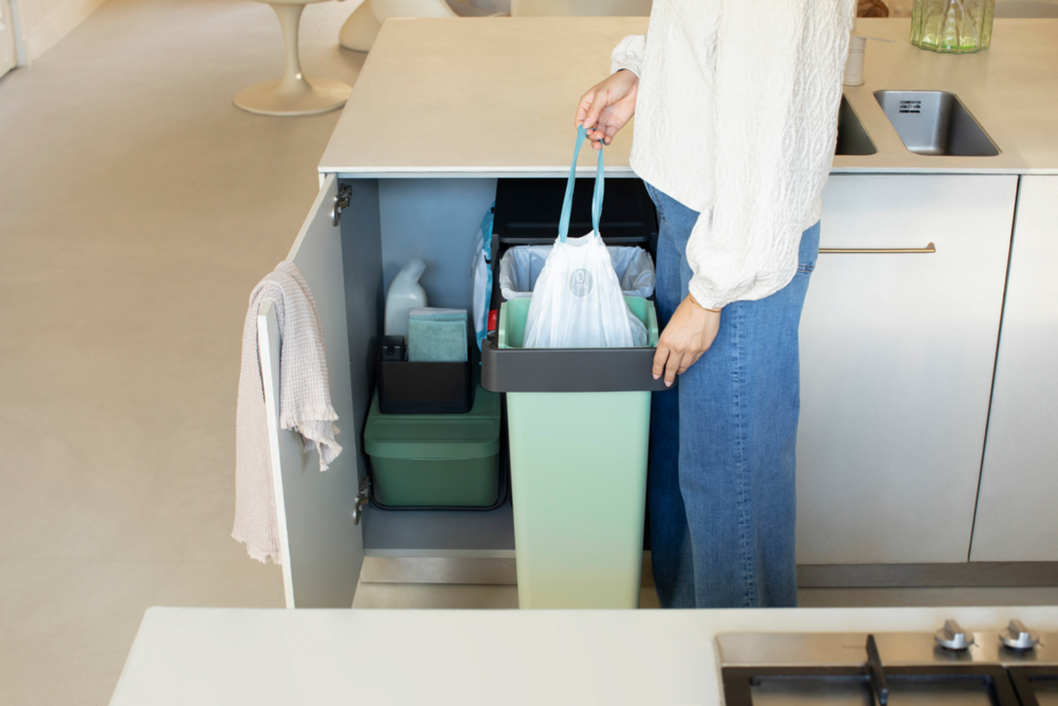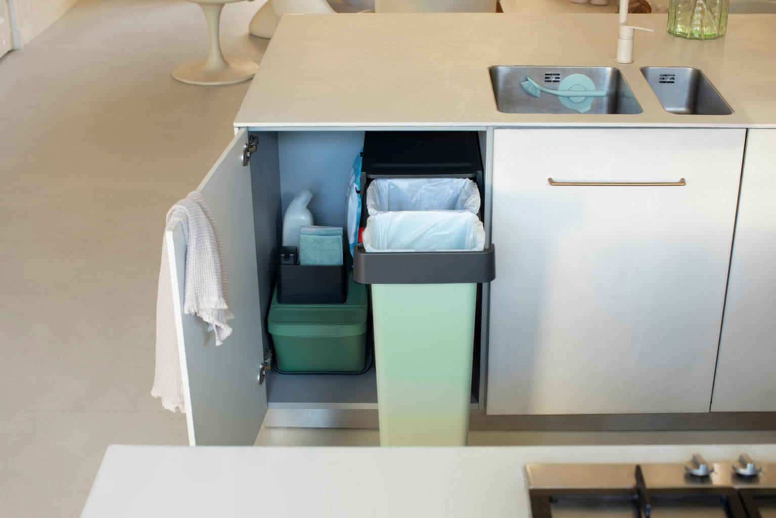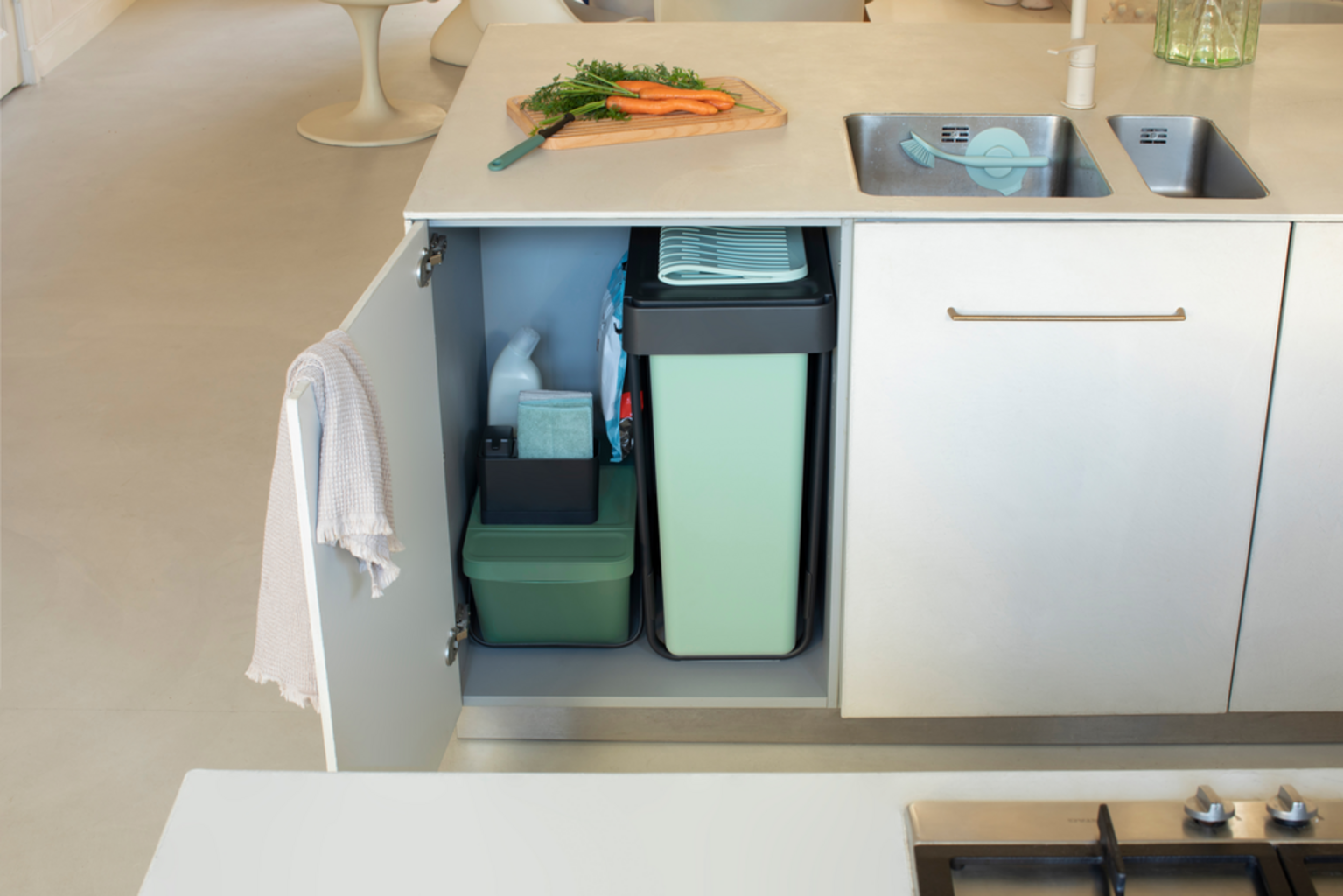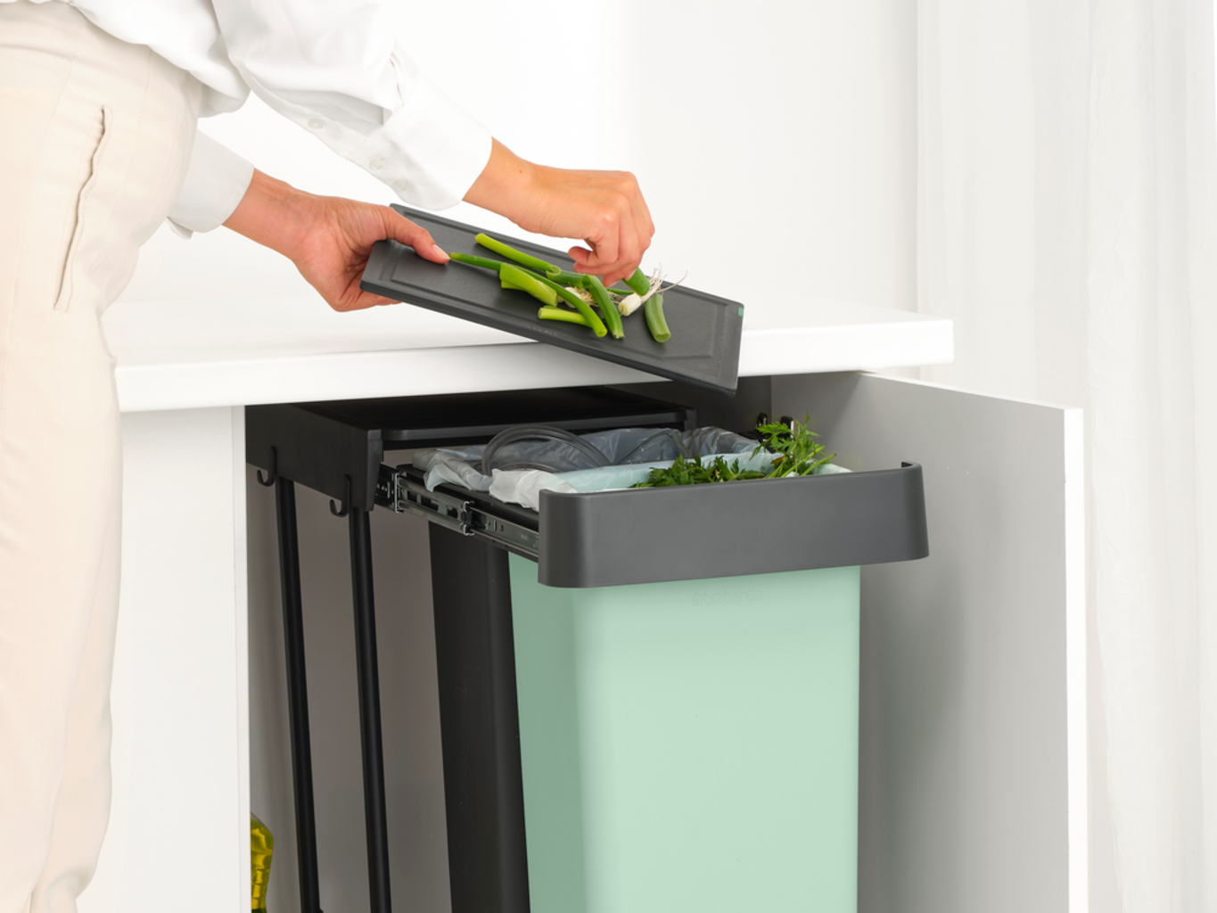 Pametne ugradbene kante za smeće iz kolekcije "Sort & Go" iz Brabantije savršeno se daju sakriti zahvaljujući svom dizajnu koji štedi prostor.