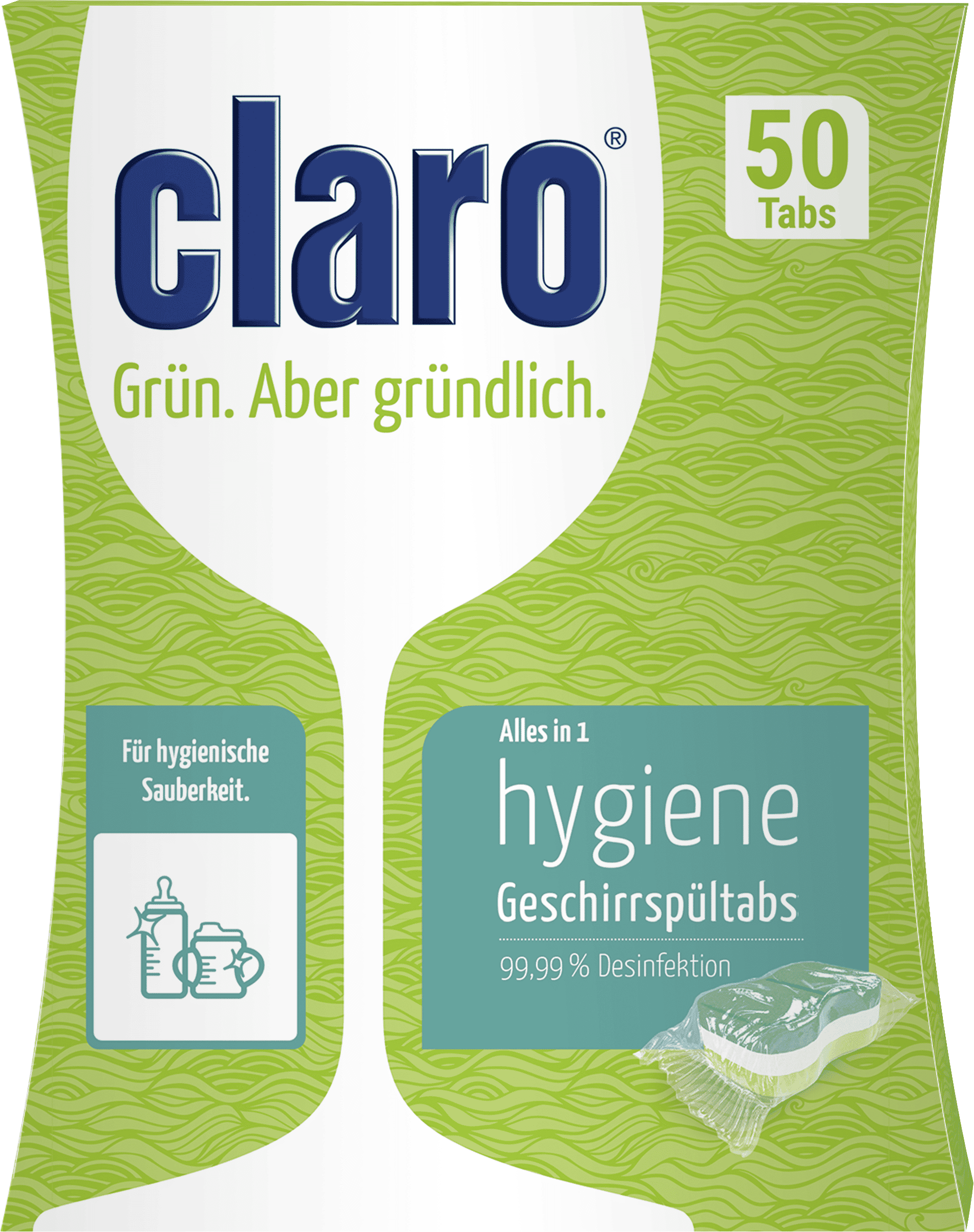 Claro higijenske tablete posebno su prikladne za osobe s alergijama jer uklanjaju 99,99% svih bakterija, virusa i gljivica. Dječje posuđe i bočice su također temeljito očišćene od ostataka i higijenski očišćene.Naravno, jezičci se mogu koristiti i za pranje klasičnog posuđa. Budući da su zamjene za sol i sredstvo za ispiranje već uključene, nije potrebno koristiti dodatne proizvode. Tablete razvijaju svoju punu učinkovitost čak i pri niskim temperaturama i impresioniraju svojom funkcijom protiv kamenca.