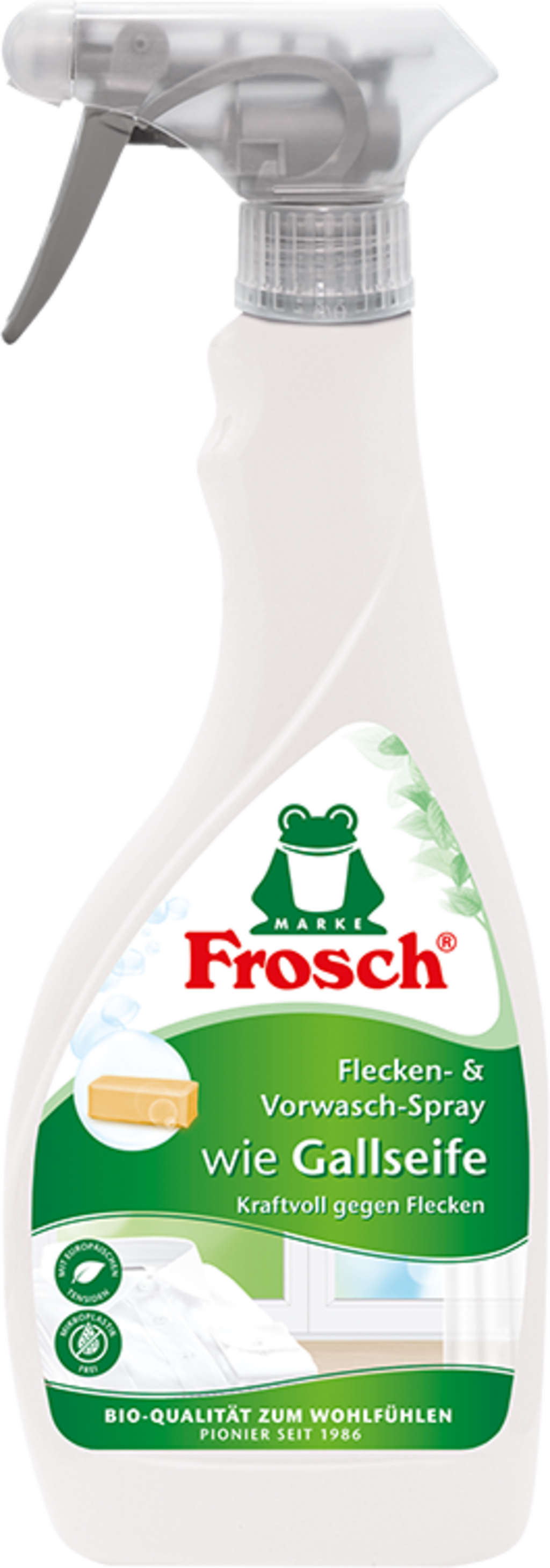 Ovaj sprej protiv mrlja i za pretpranje marke Frosch djeluje poput žučnog sapuna – i to uz 100 % vegansku formulaciju! Zaprljanja koja sadrže enzime i bjelančevine, poput mrlja od krvi, trave, kakaa ili sladoleda, uklanjaju se iz tekstilnih vlakana u tren oka, a nestaje i prljavština s ovratnika. Sprej je prikladan za bijelo i šareno rublje te omogućuje snažno uklanjanje mrlja uz istovremeno očuvanje boja.