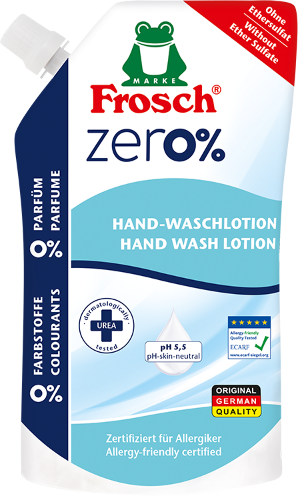 Zero Sensitiv losion za pranje ruku marke Frosch idealan je za osjetljivu kožu i često pranje ruku. Hipoalergena formulacija sadrži bogatu ureu, pa losion osigurava nježno čišćenje i dragocjenu njegu.