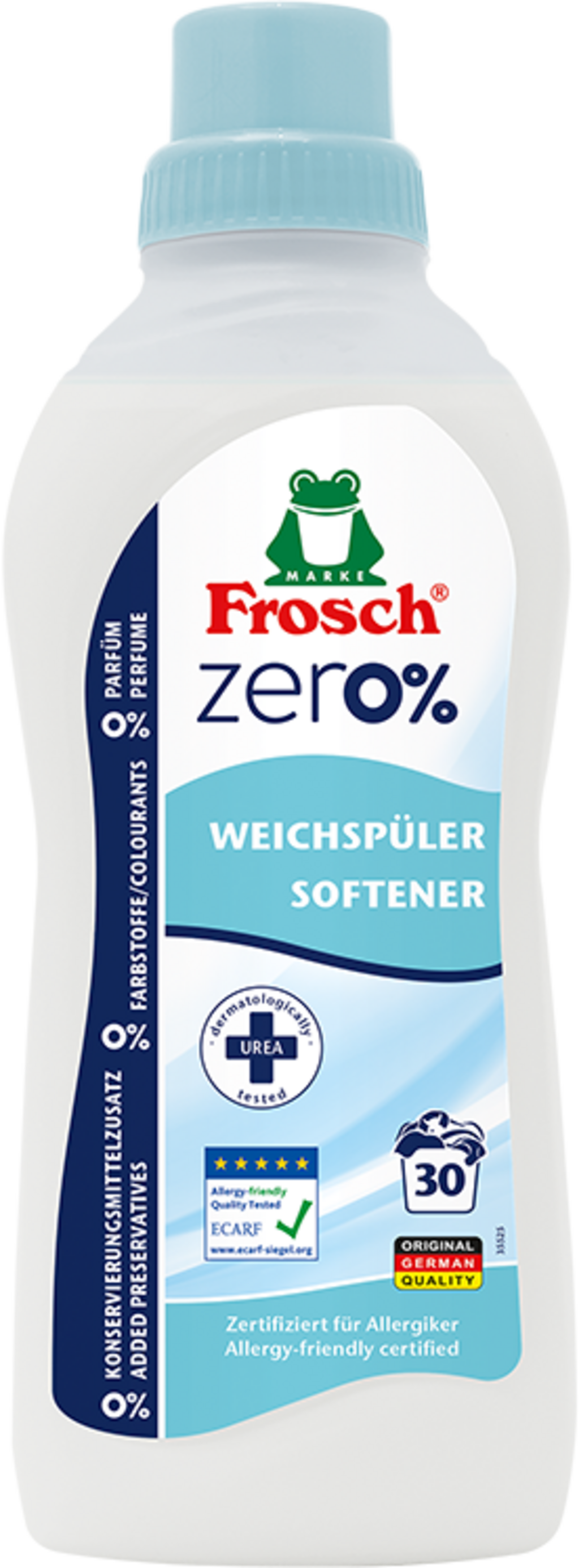 Zero Sensitiv omekšivač marke Frosch njeguje vlakna vaših tkanina i čini rublje predivno mekim! Osim toga, rublju daje nježan, svjež miris – za savršenu udobnost nošenja! Blaga, hipoalergena formulacija ne sadrži bojila, parfemska ulja ni dodane konzervanse te sadrži ureu koja njeguje kožu – stoga je ovaj omekšivač idealan za osobe s osjetljivom kožom!