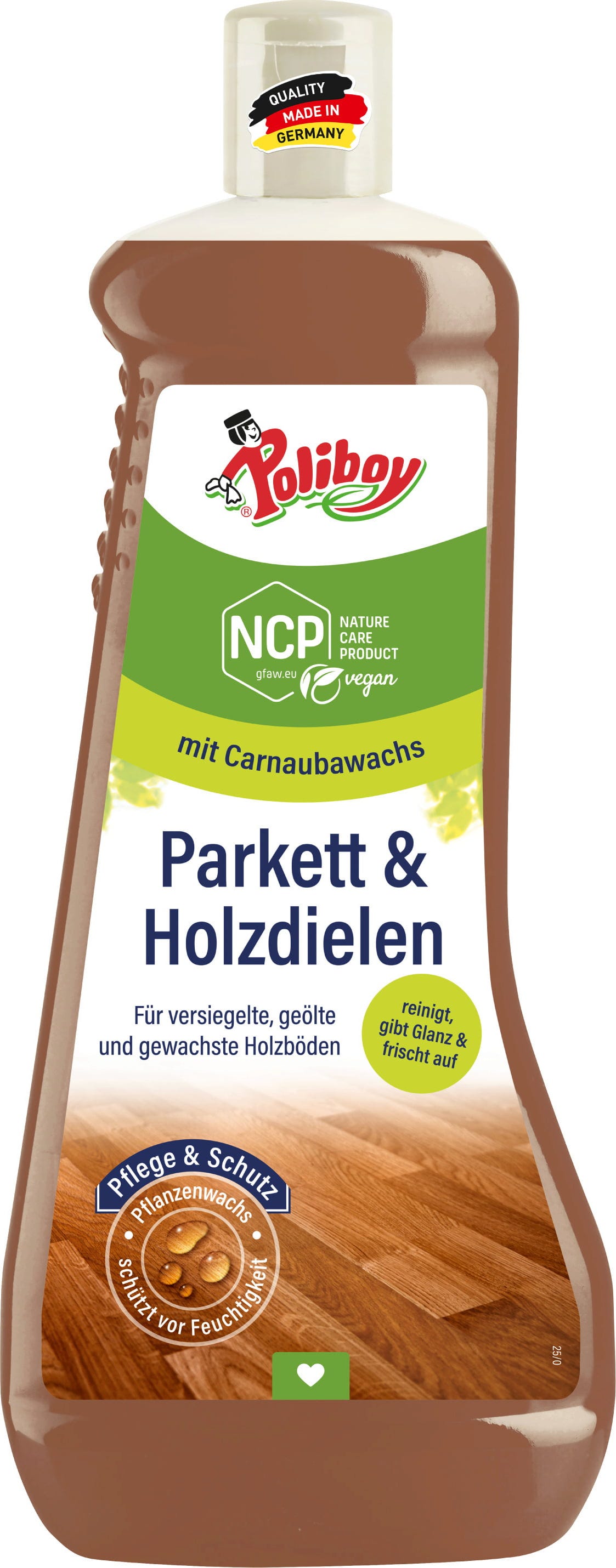 S ovim sredstvom za čišćenje parketa i drvenih podova ne samo da postižete temeljito čišćenje svojih podova od pravog drva, već i prirodnom materijalu pružate sveobuhvatnu njegu: ekološki prihvatljivi šećerni tenzidi uklanjaju prljavštinu i naslage s vašeg poda, dok bogati karnauba vosak njeguje drvo.