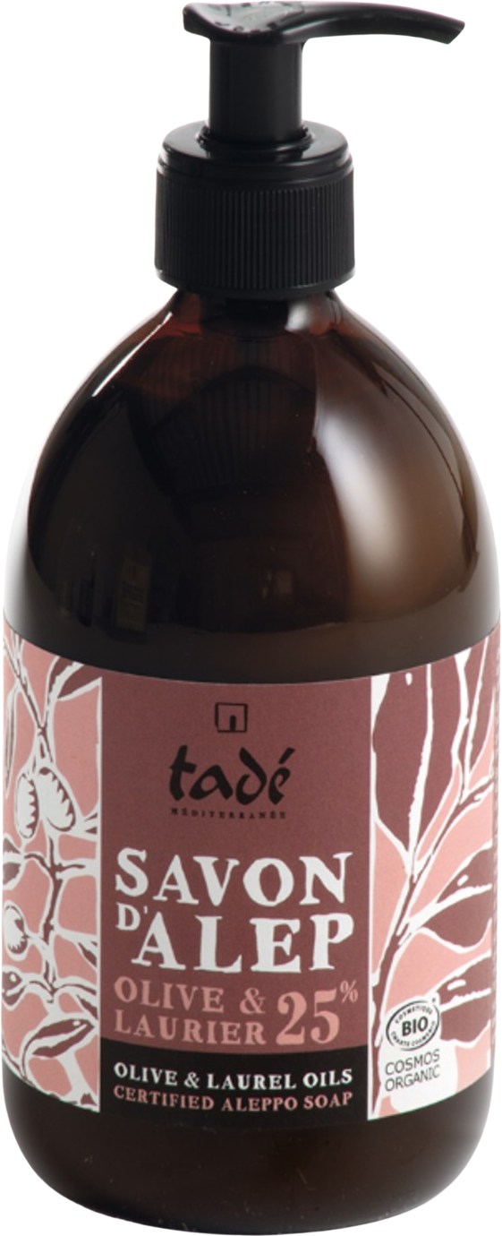 Aleppo tekući sapun sa 25% sadržaja lovorovog ulja idealan je za osjetljive tipove kože. Proizvodi se u malim serijama tradicionalnim alepskim postupkom saponifikacije u kotliću i kombinira dragocjena ulja masline i lovora, a već su Hipokrat i Galen pohvalili njihova kozmetička svojstva. Formula je bogata esencijalnim masnim kiselinama, vitaminima i antioksidansima, nudi vitalnost, svježinu i dubinski čisti kožu, ali bez isušivanja.
